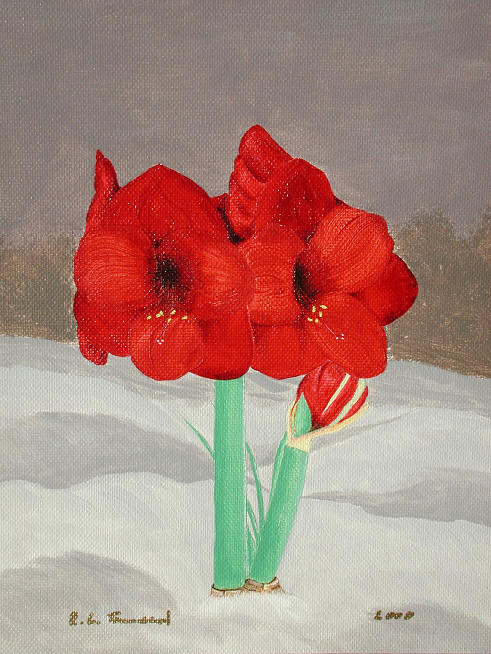 Winter's Passion -2000 A freestyle painting of Amaryllis flowers blooming in winter snow. Acrylic on Canvas Dimensions (10x12 Inches) Private Collection