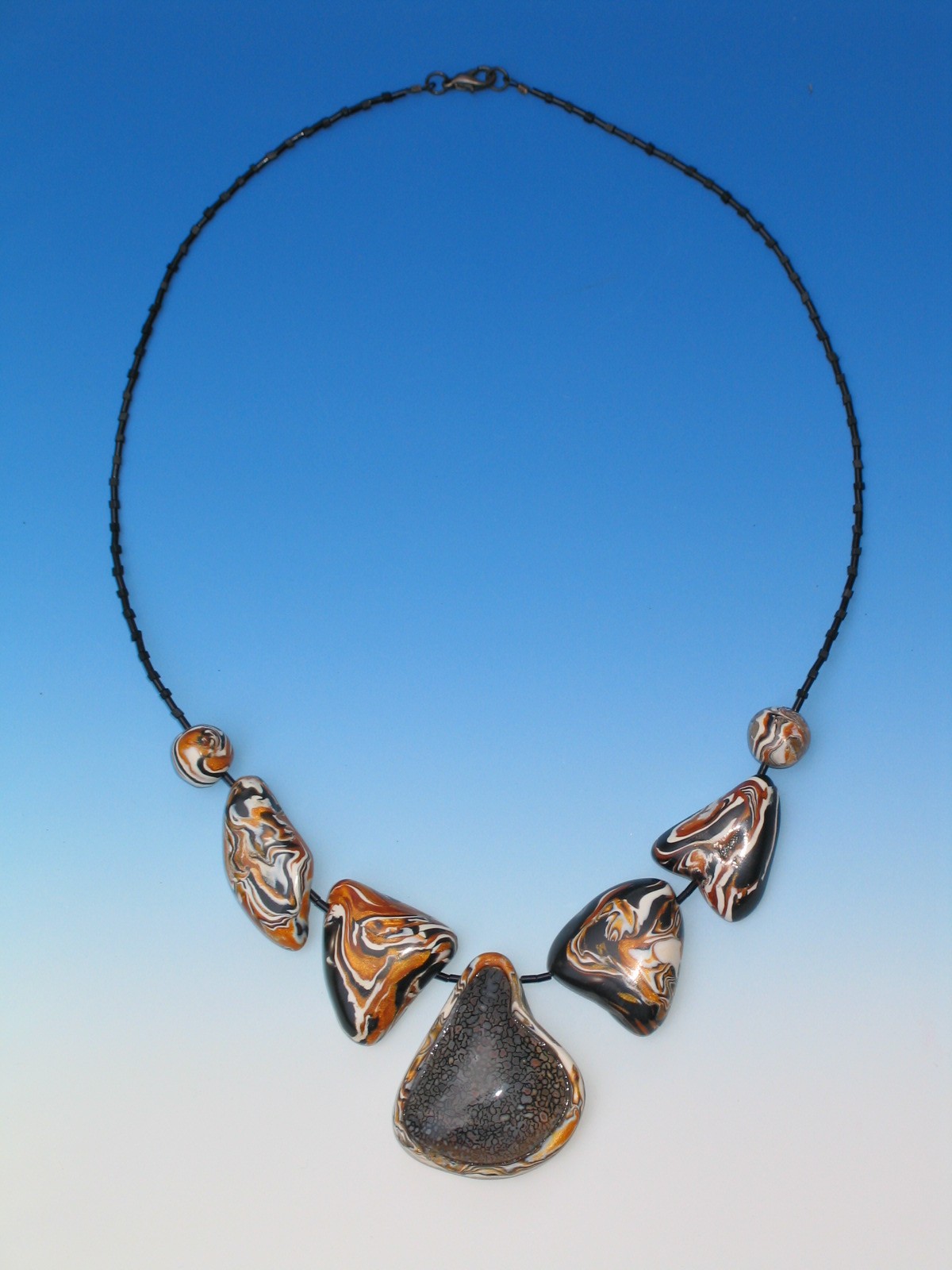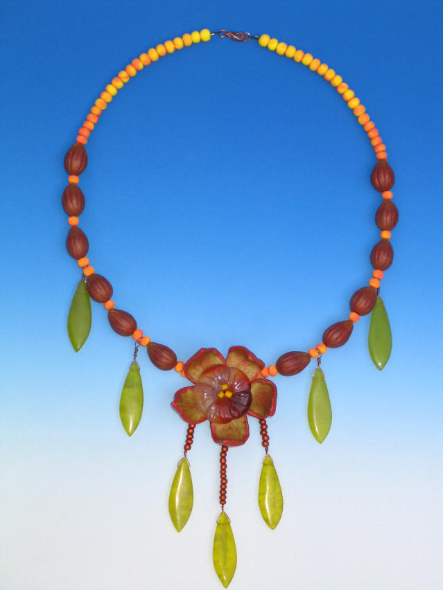 This piece was inspired by cocoa pods and tropical flowers in Costa Rica. Liquid and solid polymer clay, carnelian, Korean jade, and copper wire 22 inch necklace $195