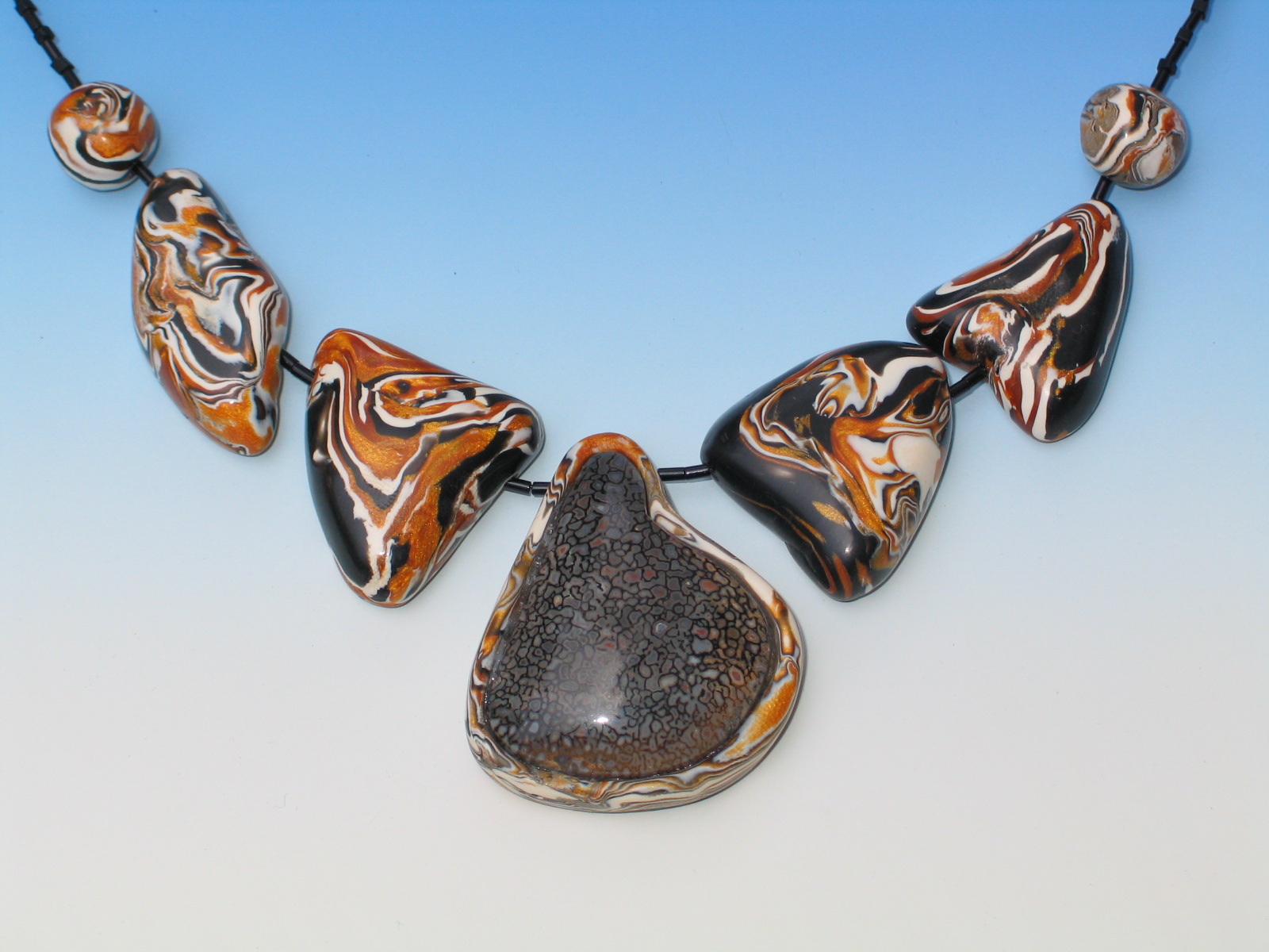 This piece was inspired by the Japanese technique of Mokume Gane merged with fossils from the southwest. Liquid and solid polymer clay, fossilized dinosaur bone, beads, and wire 20 inch necklace $95 Noche Floración - 2004 This piece was done as a decorative arts study using Skinner blends and canes over a glass bottle. Liquid and solid polymer clay, glass bottle 7 x 2 x 2 inches $115 Information Request FormPleas let us know if you have any questions about Liakura Studios or any of these pieces. |