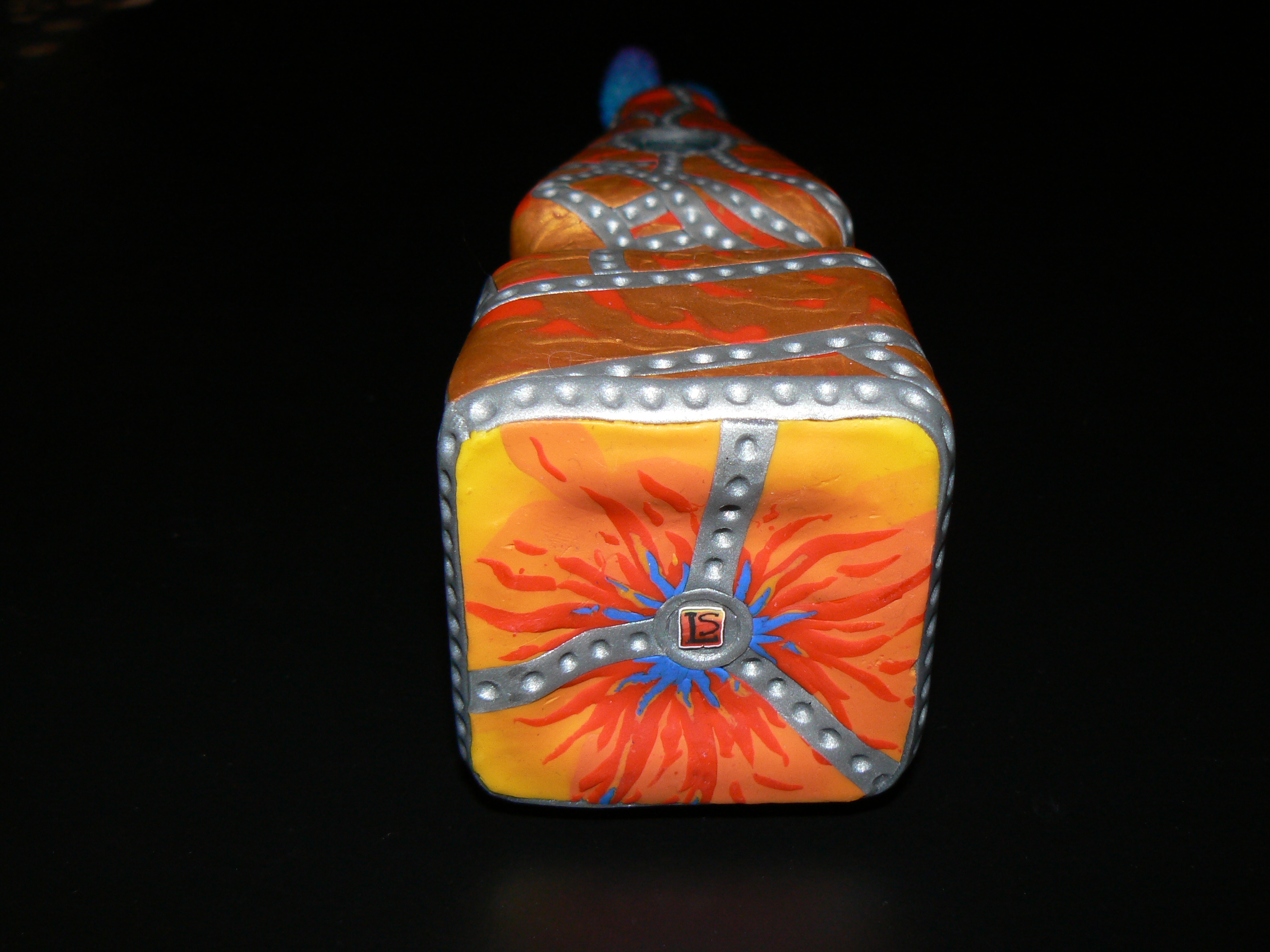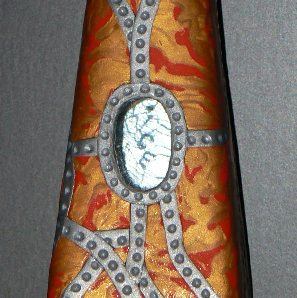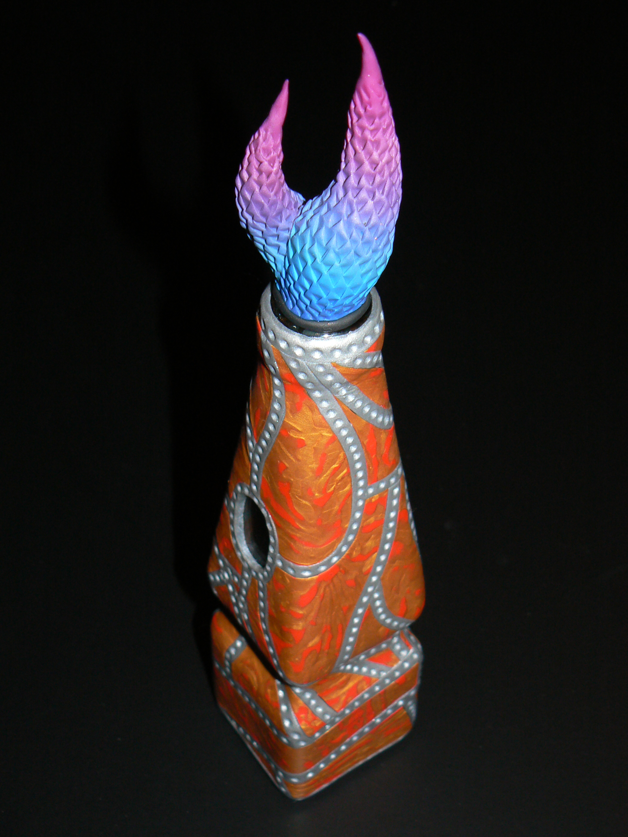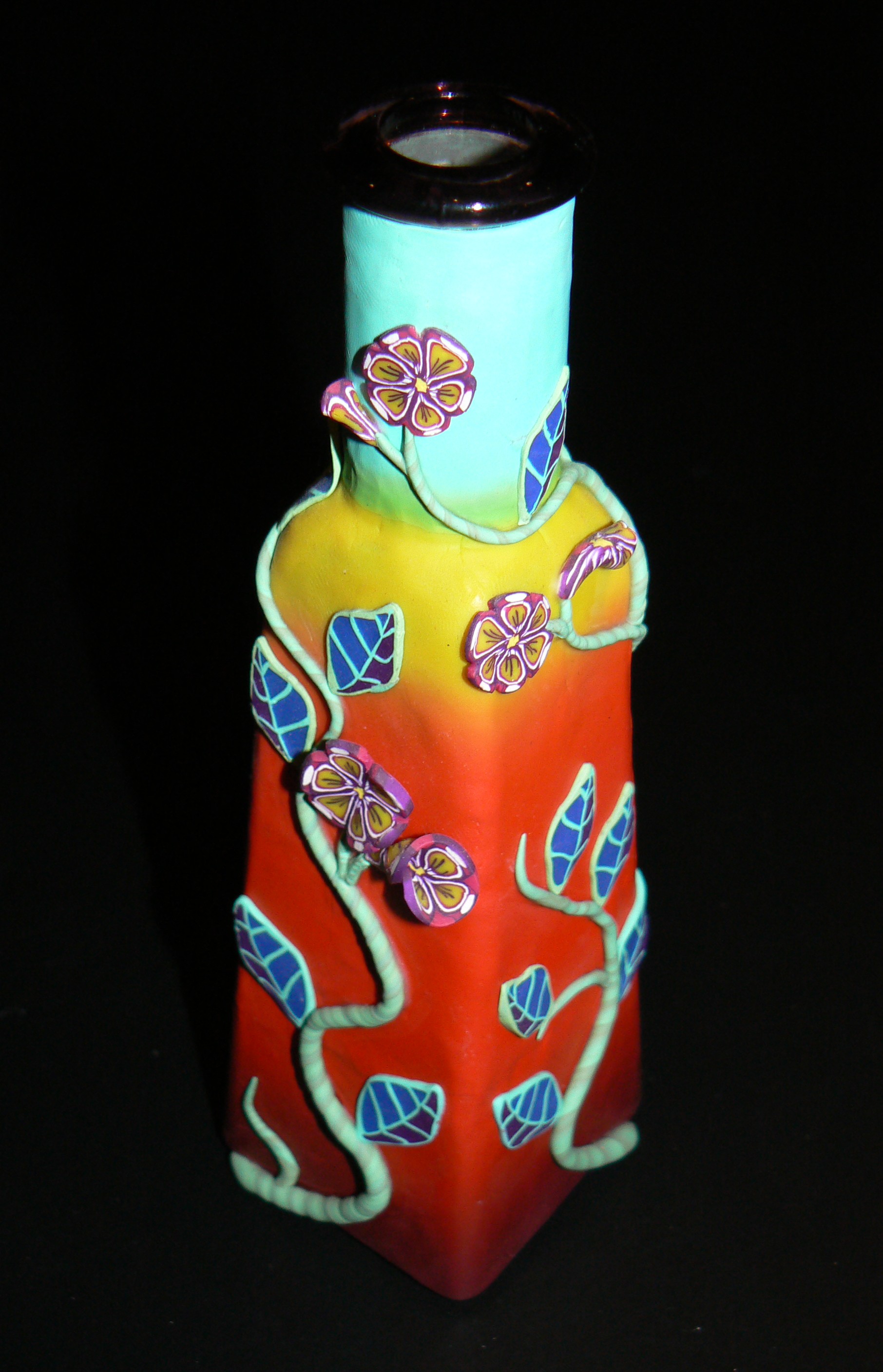 Fire & Ice - 2006 This piece was inspired by the look of iron girders, molten glass furnaces, and cool torch flames. It was achieved with mokume gane and surface mosaic work. Liquid and solid polymer clay, glass bottle 11 x 2 x 2 inches $245