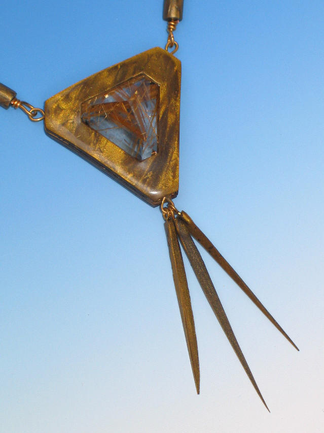 This piece was an exercise in mounting semi-precious stone directly into polymer clay. Liquid and solid polymer clay, rutilated quartz, wire 20 inch necklace $115